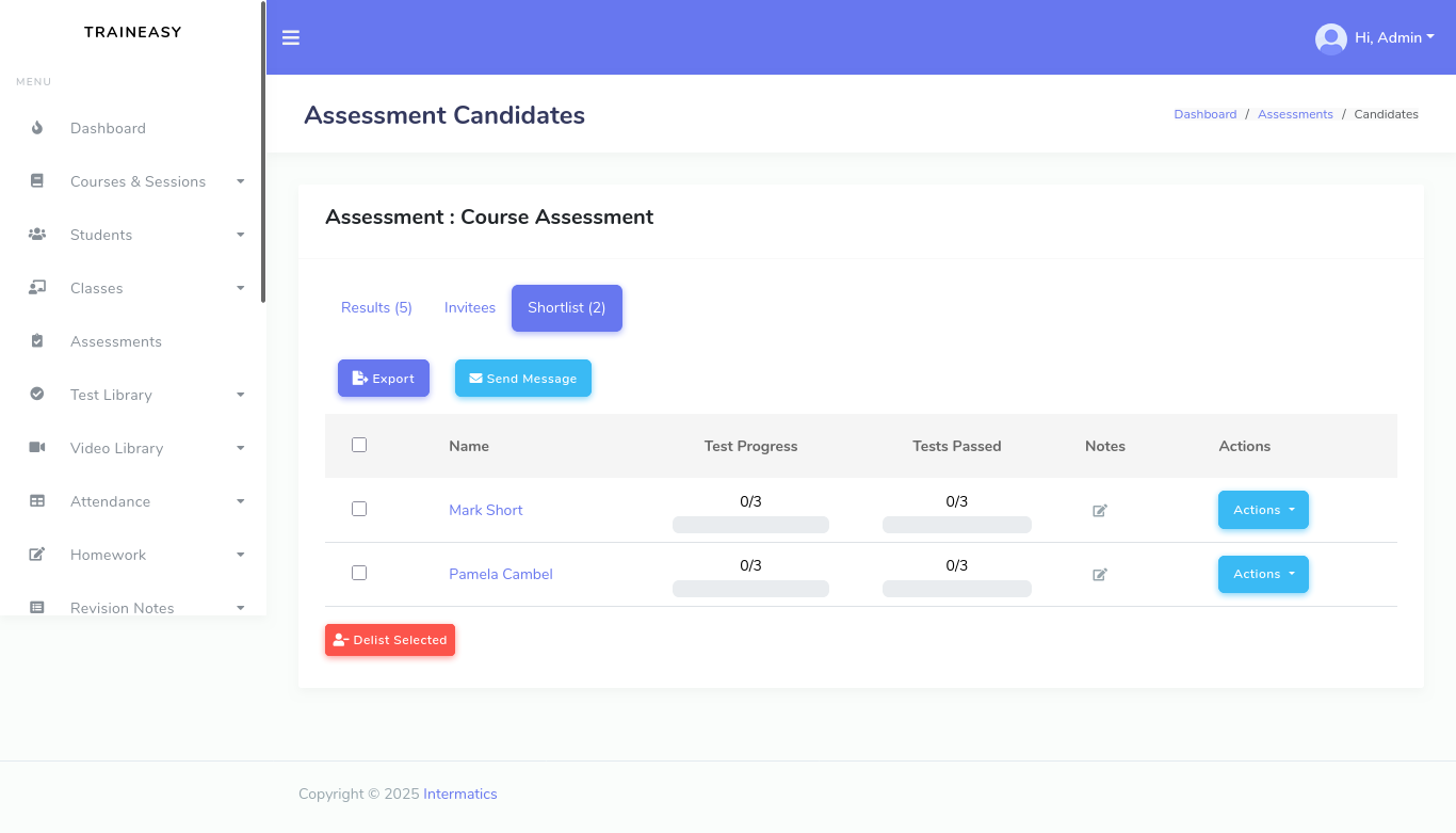 On the candidate display table, you can see the progress of the candidates. The actions button allows you to view the candidate's details (assessment performance, question answers, webcam snapshots, and biodata), shortlist the candidate, send a message, or remove the candidate from the assessment. Removing the candidate will not delete their account on the platform.