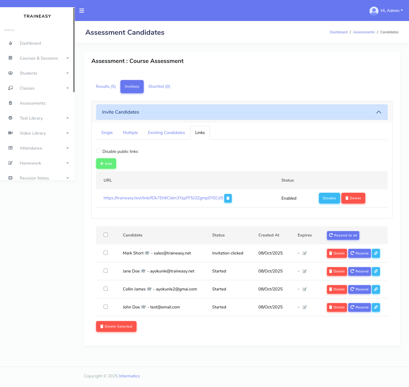 - Candidates and Links: Allows you to invite candidates, view existing candidates and results, and manage public links for the assessment.