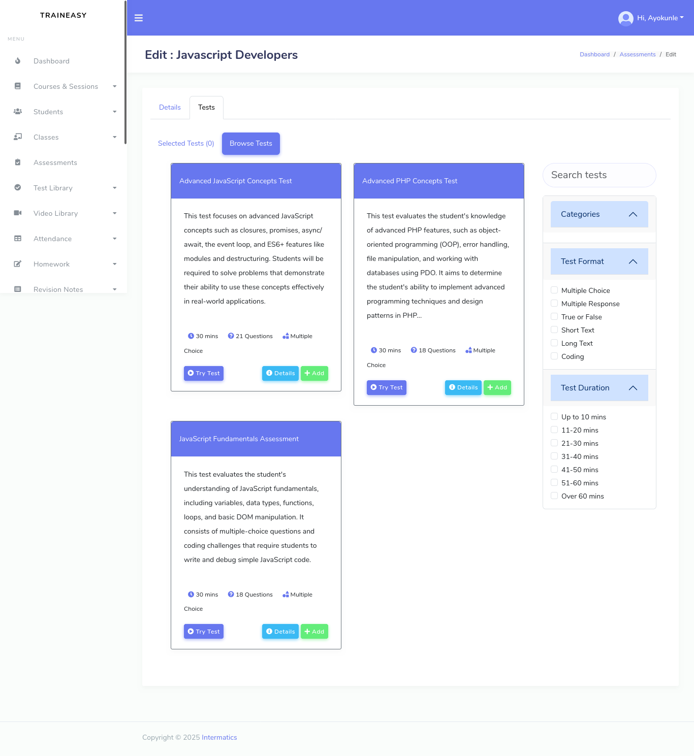 You can browse all tests available in the library. Click on the 'Add' button to add the test to your assessment. The test will then be listed in the 'Selected Tests' tab. In the 'Selected Tests' tab, you can drag and drop tests to rearrange the order in which they will be presented to your candidates.